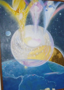 In this painting, we see three huge beings creating a sphere of Light for the betterment of Earth, with the golden sun rising on the right.